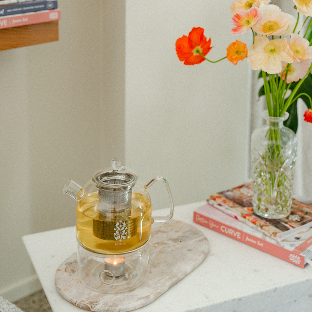 Includes a Bestow Teapot, Bestow Tea Warmer, Puritea Tin, 20 Puritea samples and 20 tea infusers
